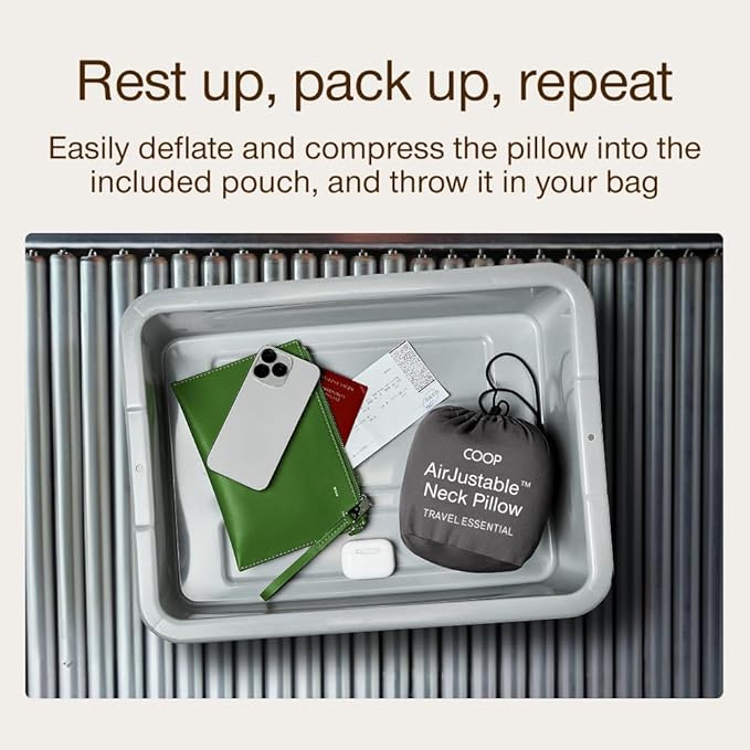 - The Ultimate Customizable Travel Essential: Bring Coop’s signature adjustable comfort anywhere with the AirJustable Travel Neck Pillow. This airplane pillow features a unique inflatable design, offering personalized head, neck, and chin support that adapts to your sleep style. Featuring Coop’s memory foam Oomph fill and an adjustable cord, this travel pillow provides unmatched comfort in any position. Say goodbye to neck strain and restless naps, and enjoy deep, restful sleep on your travels!