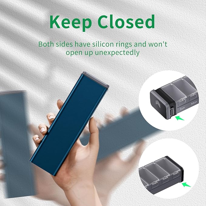 - Safe Travel Pill Holder: The 7 day travel pill organizer has silicon rings on both sides, so you donโt have to worry about them popping open and making it easier to take your medication on the go