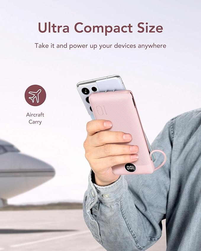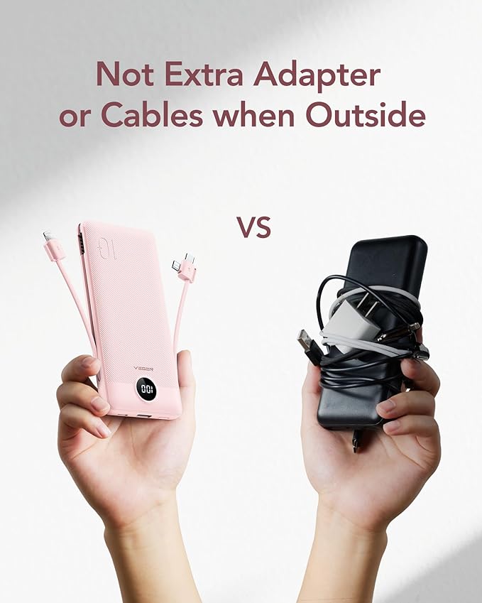 VEGER Portable Charger with Built-in AC Plug and Cables, All in One 10000mAh Ultra Slim Power Bank Travel Essentials, 15W Fast Charging Battery Pack Compatible with iPhone, Samsung, Android (Crepe)