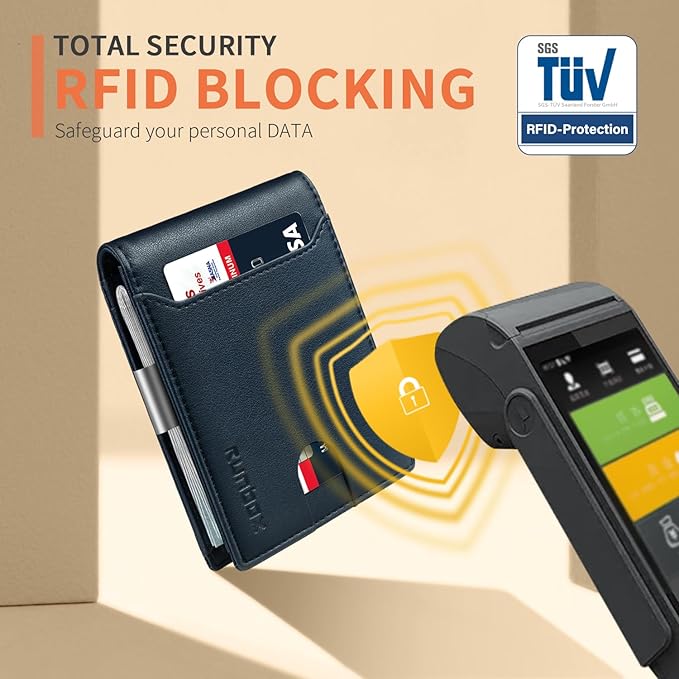 - 𝐑𝐅𝐈𝐃 𝐀𝐧𝐭𝐢-𝐓𝐡𝐞𝐟𝐭 𝐒𝐄𝐂𝐔𝐑𝐈𝐓𝐘 - this slim wallet for men equipped with German Instiute Certified RFID Security technology, a unique metal composite, engineered specifically to block 13.56 MHz or higher RFID signals to protect the valuable information and privacy