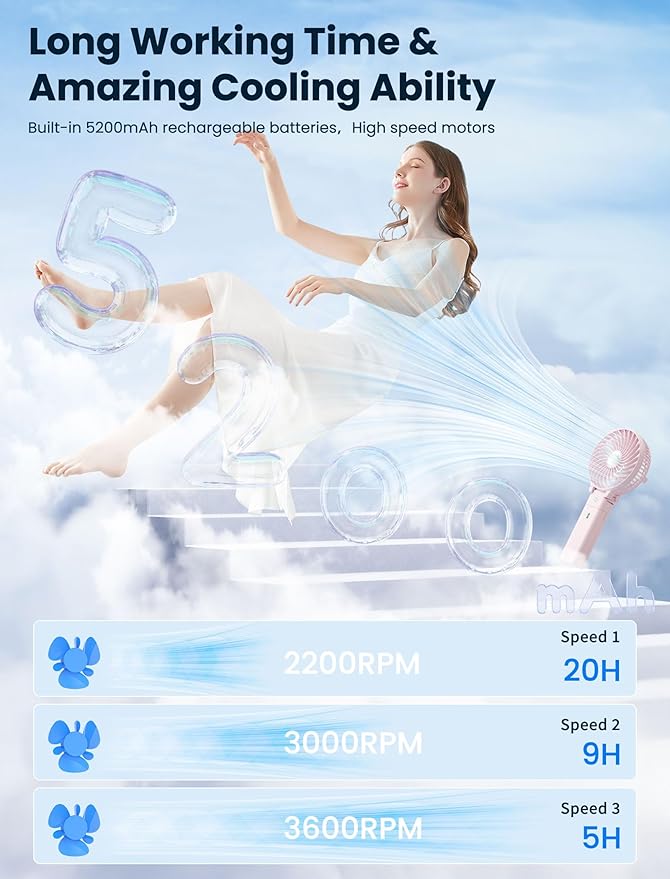 - 【Max 20 Hours Cooling Time】 Built-in 5200mAh rechargeable battery, the real capacity - not false claims. This hand fan provides up to 20 hours of cooling on a single charge, ensuring you stay cool during travel, concerts, workouts, and outdoor activities