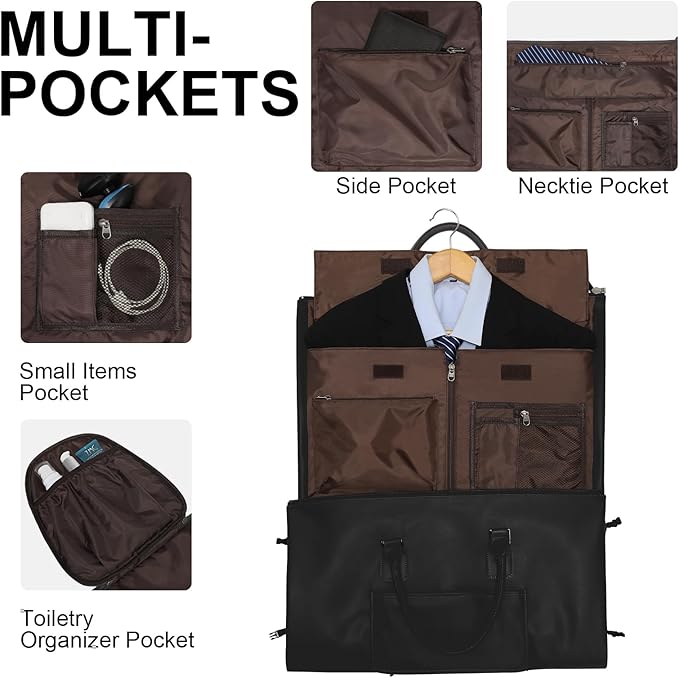 - 45L DUFFEL BAG with SHOES COMPARTMENT: After assembled, this garment bag works perfect as a 45L duffel bag/roller luggage. At the left side pocket of this leather garment bag is a shoes pouch. And the right side pocket is designed for passport, keys and some other small items. Vegan leather garment bag has also got two front pockets for small items for quick access