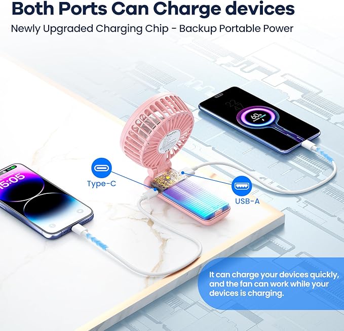 - 【Small In Size, Big On Function】Featuring a Backup Charger, lanyard, 180° foldable, it can be used as a handheld fan, desk fan, neck fan. Also a backup Power. the portable handheld fan is your summer essential for staying cool on hot days while offering versatile functionality to meet your diverse needs
