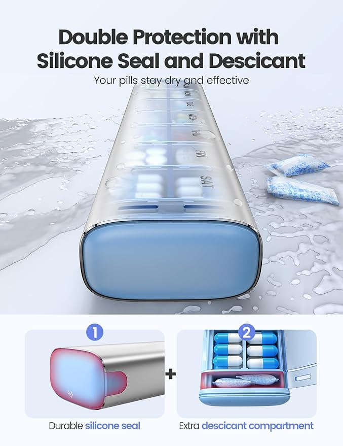 - 【Revolutionary Moisture-Prevention Design】Featuring a pioneering drying agent chamber and individual lids for each compartment, our pill case sets new standards for keeping medications dry and safe. This innovative travel pill organizer feature safeguards your medication from moisture, essential for maintaining pill efficacy and longevity. It is especially vital as part of your travel essentials for both women and men alike.