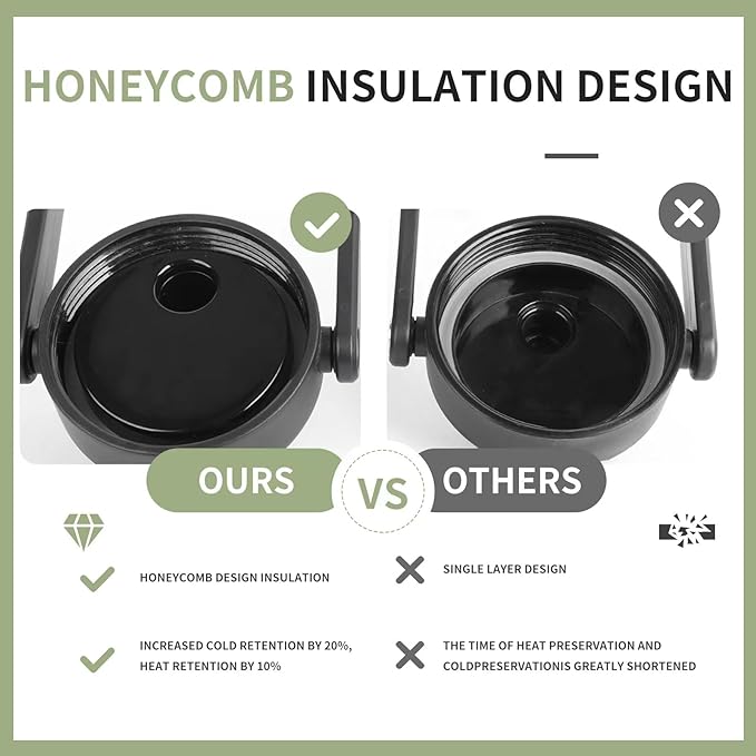 - INSULATION AND COOL KEEPING TECHNOLOGY UPGRADED: This insulated kettle is made with double-wall and vacuum-sealed insulation technology, and our lid is designed with a built-in honeycomb thermal insulation layer, which retains 20% cooler and 10% hotter than ordinary single-layer lids on the market, and keeps beverages cooler for up to 48 hours and hotter for up to 24 hours.