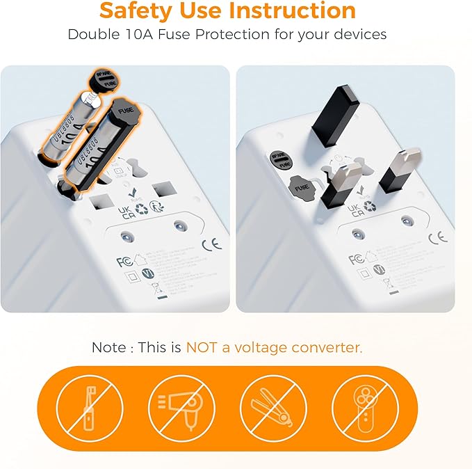 - Safety Protection: The travel plug adapter worldwide with double fuse effectively protect your devices, guard your travel security; NOTE: This universal outlet adapter travel only works on 100V to 250V wide voltage devices; If you want to use hair dryer, straightener, curling irons, they need to support wide voltage