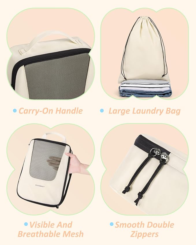 - Packing Cubes - Are you fed up with the travel kind of messy suitcase? Travel with BAGSMART PACKING CUBES and they make a world of difference. The 6-piece packing cubes contains 4 travel cubes + 1 laundry bag + 1 shoe bag, keeps your outfits in separate packing bags, and makes your luggage clean and neat while traveling