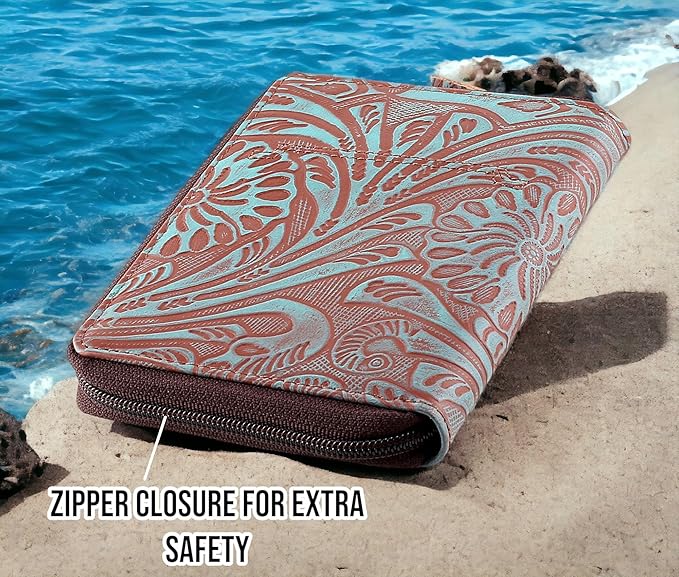Passport Wallet - Travel Document Holder w/RFID Blocking – Full Grain Leather – Bifold compact zip around Wallet with Credit Card Slots for Women and Men,Turquoise floral,500-50