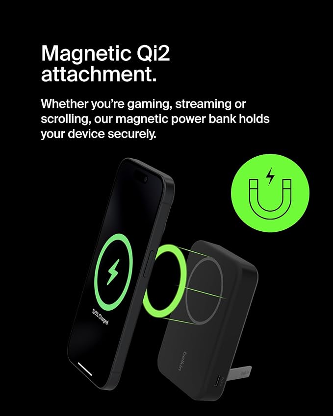 Belkin Portable Charger, Wireless Power Bank 15W 10000 mAh w/ Qi2, MagSafe Charger + Built-in Pop-up Kickstand - iPhone 17, Air, Pro, Pro Max, AirPods, Apple Watch, Google Pixel 10, etc. - Black
