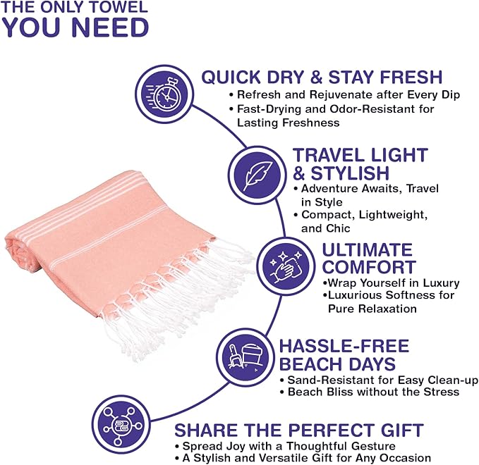 - TRAVEL LIGHT, DRY FAST: Elevate your travel experience with our refined Turkish towels. Thinner than standard terrycloth yet equally absorbent and astonishingly compact, they slide easily into any bag. Perfect for post-shower or beach use, our towels merge a space-saving design with reliable absorption, ensuring comfort during every adventure.