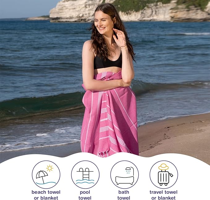 - TRAVEL LIGHT, DRY FAST: Elevate your travel experience with our refined Turkish towels. Thinner than standard terrycloth yet equally absorbent and astonishingly compact, they slide easily into any bag. Perfect for post-shower or beach use, our towels merge a space-saving design with reliable absorption, ensuring comfort during every adventure.