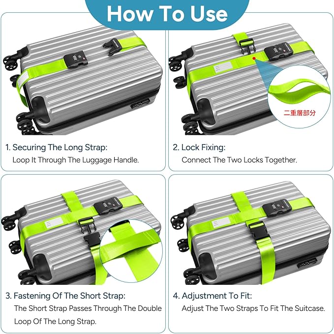 - 【Adjustable Length Luggage Straps】 Belt length: a. 47.2"-81.1" / 120-205 cm; b. 39.4"-73.6" / 100-187 cm; Luggage straps fit for 20” - 34” suitcase. Suitable for suitcase, luggage bag, backpack, duffel bag, etc. You can customize the length according to your needs, ensuring a secure and sung fit that prevents any sliding or loosening of the luggage.