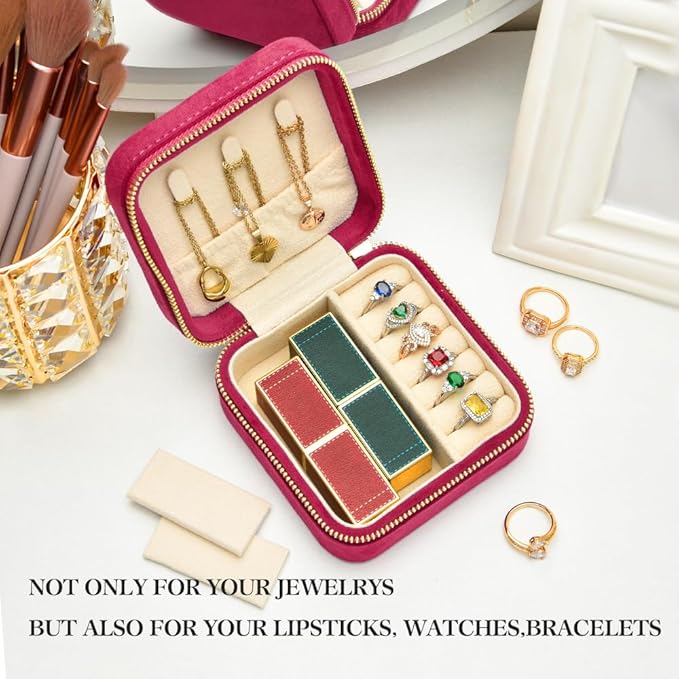 TAIMY Travel Jewelry Case, Small Plush Velvet Jewelry Box for Women and Girls, Portable Jewelry holder organizer for Rings Earrings Necklaces Bracelets(Magenta)