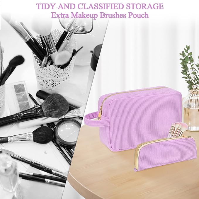 - 【Unique Organized Design】:Our cosmetic bags are made of soft and comfortable corduroy fabric or waterproof PU leather. Our spacious makeup bag includes two inside mesh pockets, perfect for storing loose powder, air cushions, and more. Complete with a convenient carry handle for easy transportation, and a makeup brush bag that neatly stores all your brushes.