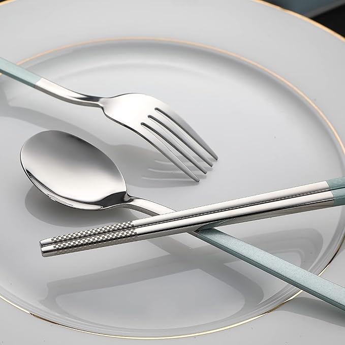 - Comfort-Enhanced Handling: Eating utensils have smooth, rounded edges and balanced heft to ensure a comfortable grip and are easy to clean. Meanwhile, laser-etched chopstick patterns prevent slipping, optimized for both steak dinners and sushi nights