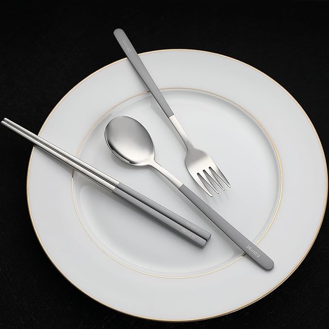 - Comfort-Enhanced Handling: Eating utensils have smooth, rounded edges and balanced heft to ensure a comfortable grip and are easy to clean. Meanwhile, laser-etched chopstick patterns prevent slipping, optimized for both steak dinners and sushi nights
