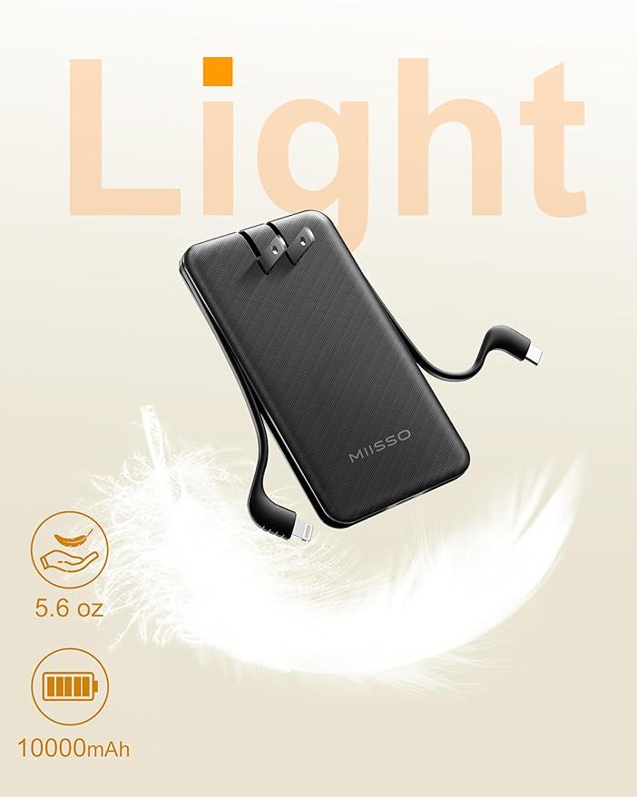 - Power Bank with Cable: Not only has USB C cable, but also has IP cable, miisso power bank is compatible with iPhone, Android devices, and USB-C mobile phones and smart devices etc. You do not need to take charging cables