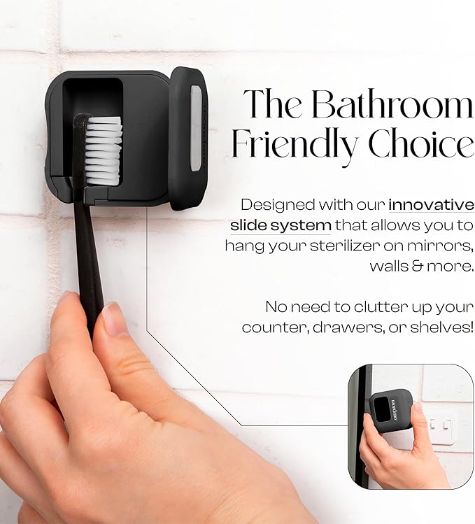 - UV TOOTHBRUSH HOLDER WALL MOUNTED: Enjoy a clutter-free bathroom with our sleek toothbrush sanitizer, ideal for both home and travel. Attach it effortlessly to your bathroom mirror or wall using our innovative slide system. Our wireless UV toothbrush covers simplify maintaining a clean toothbrush, bringing convenience without clutter to your daily routine.