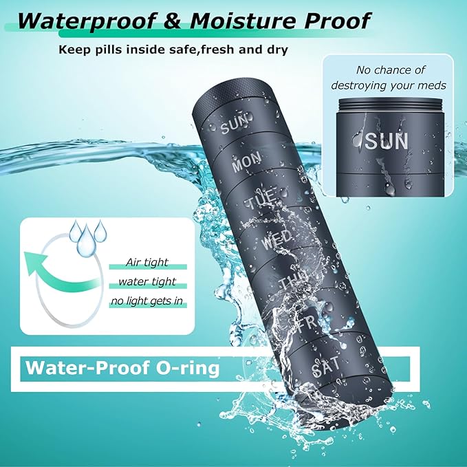 - 【MOISTURE PROOF & WATER PROOF】There are seal rubber gaskets on each compartment to ensure it’s water tight and air tight, protect the pills from moisture, dust, and UV light keeps them dry ,fresh and effective. Not worry about destroying your meds when you are on vacation, trip, camping or any outdoor activity.No moisture or humidity damage like in the usual flimsy plastic pill holder .