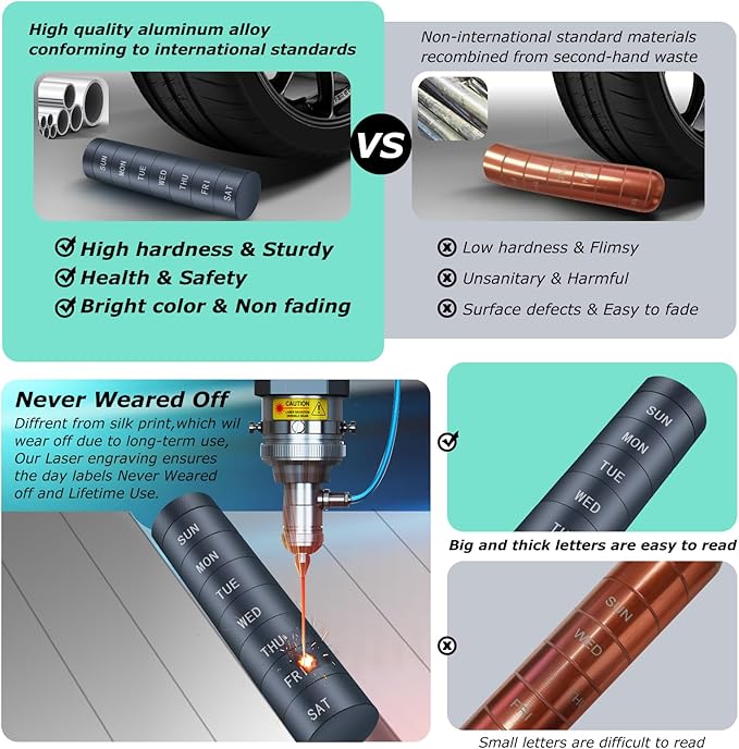 - 【 Laser Engraving Technology】Instead of regular printing craft,our vitamin organizer uses Upgrade Laser Engraving Technology ,which is durable and hard enough to promise never weared off.The days are etched into the metal firmly and make letters on it clearly visible.You can use our pill container permanently.