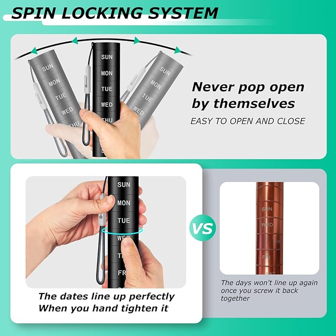 - 【BEST FOR ON THE GO TRAVLE】Rotating locking design to help lock your medicine safely and easy to open and refill.After being locked, it will stay closed, won't pop-open or spill out accidently in your handbag, suitcase, backpack,purse when traveling.Stackable detachable supplement organizer allows you to take only the days you need.save much more room traveling makes you easily enjoy your journey .