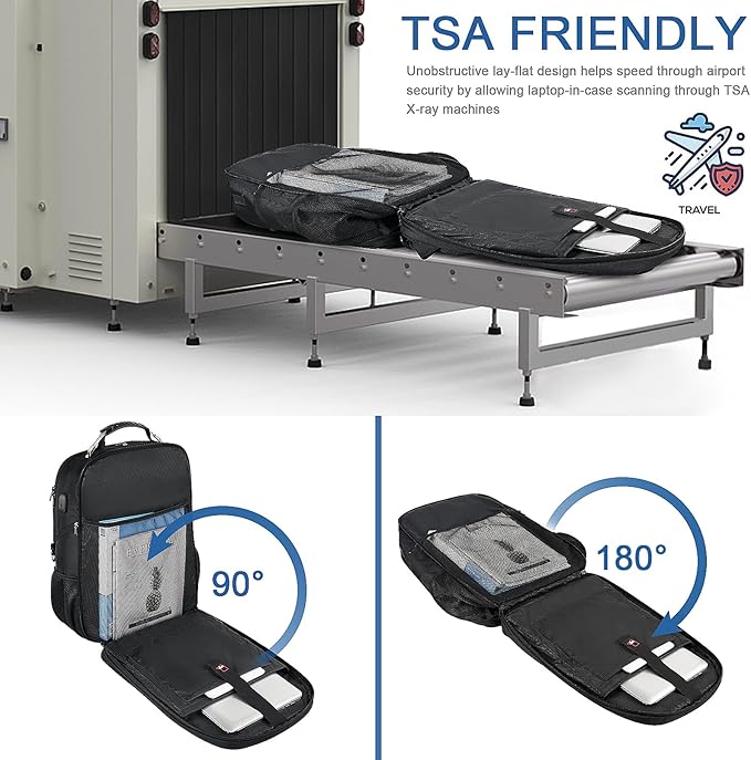 - 【TSA Approved & Comfy】: Unfolds the travel backpack carry on freely 90-180 degree to make you quickly pass through the airport security and keep items tidy. Adjustable shoulder straps padded help relieve stress from your shoulder. A luggage strap allows black backpack fit on the trolley of your luggage/suitcase; Adjustable chest strap brings the shoulder straps in tighter to the chest, help you lock your backpack in place securely. Mens backpack is perfect for indoor/outdoor activities