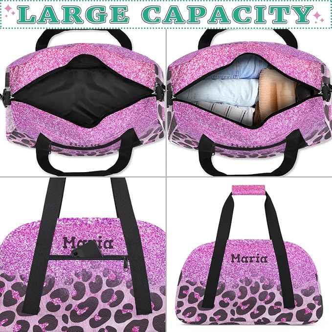 Personalized Kids Sports Duffel Bag with Name Custom Weekender Overnight Bag for Boys Girls Gym Bag Travel Dance Gymnastics Duffel Bag, Purple Glitter Leopard Print