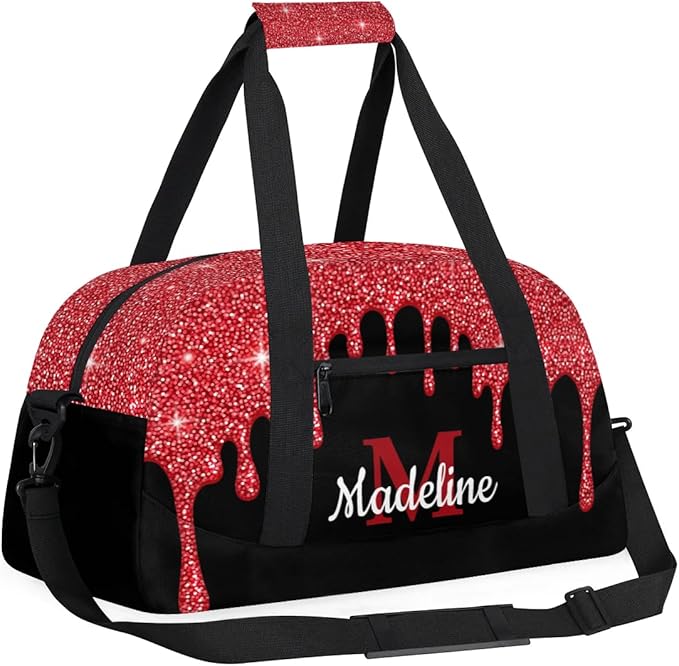 Personalized Kids Sports Duffel Bag with Name Custom Weekender Overnight Bag for Boys Girls Gym Bag Travel Dance Gymnastics Duffel Bag, Red Glitter