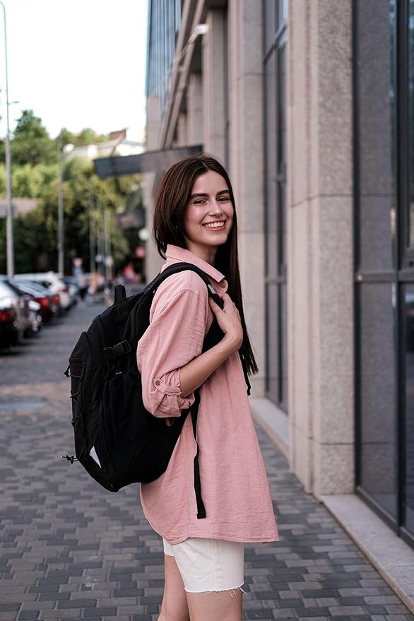 - Large Capacity & Multiple Pockets: The travel backpack features 4 spacious compartments to accommodate both daily essentials and travel necessities. Its main compartment offers ample room, holding 5-8 articles of clothing, books, and other items. The separate laptop compartment comfortably fits a 17" laptop. Additionally, the carry on backpack for women has multiple pockets and an elastic cord system, ensuring organized storage and providing extra space for your belongings.