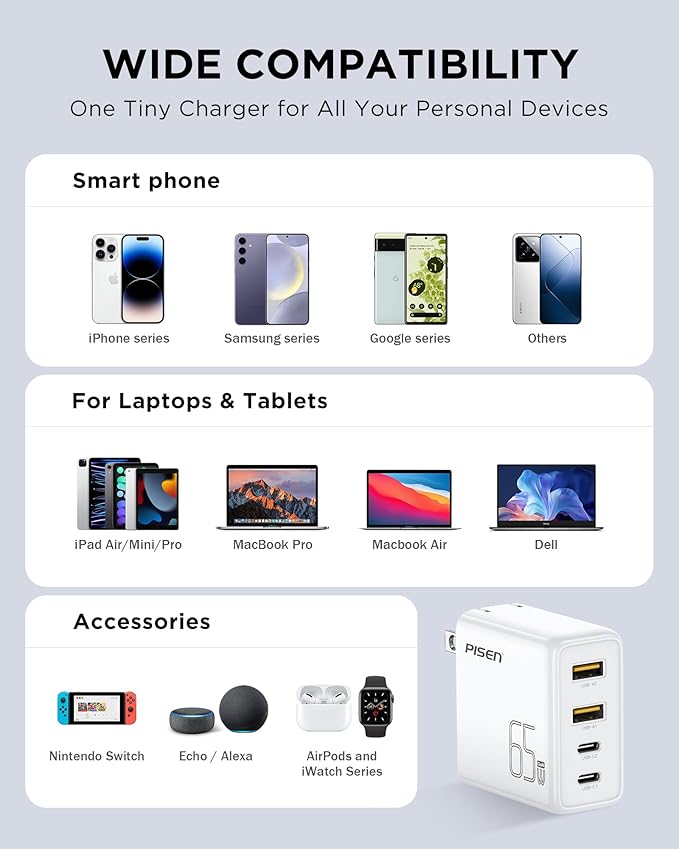 - [Wide Compatibility]: PISEN 65W USB C charger block is compatible with iPhone 16/ 15/ 14/ 13/ 12 series, iPad Pro, Galaxy Z Flip 4/ S23/ S22 Ultra/ S22/ S21/ S20/ Note 20/ Note 20 Ultra/ Note 10+, Google Pixel 7 Pro/ 6a/ 5/ Switch and more electronic devices.