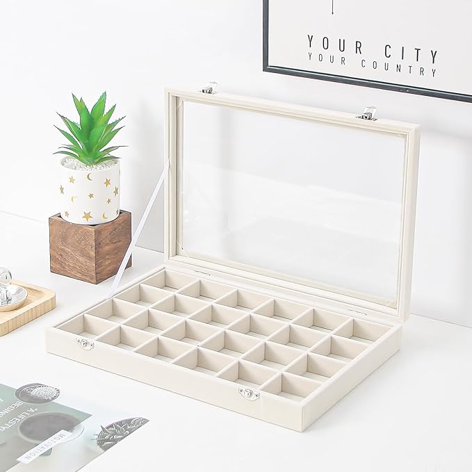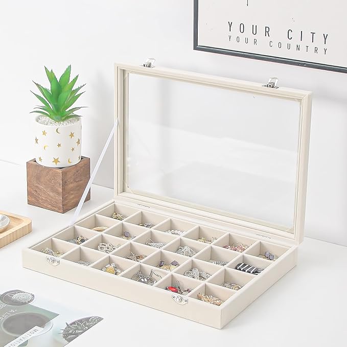 Coward Jewelry Organizer Box, Beige Velvet 24 Grids Ring Earring Jewelry Display Tray Case with Transparent Glass Lid for Home Drawer or Shop Selling