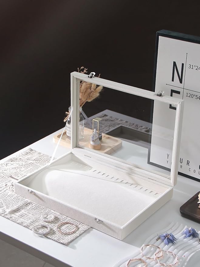 - Instead of cheap plastic lid, we us thick clear glass window at the top of the jewelry case, that allows you to see all the jewelry at a glance.