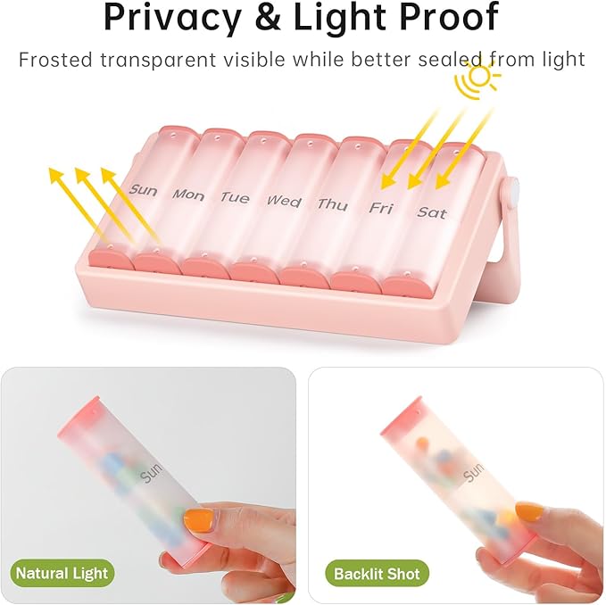 - Wear-resistant & Rotatable Handle: With 3000 times rotation tested, the handle of the 7 day pill organizer travel is wear-resistant enough and can holds the compartment firmly. 290° rotating design enable it to support the vitamin organizer 7 day and provide the best angle for taking out the compartment