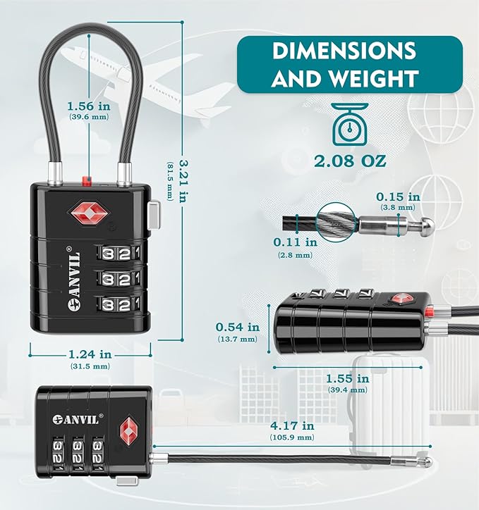 - ★ Easy-to-Set Personal Combination: The ANVIL Luggage Lock is designed for ease of use, featuring an easy-to-read dial for quick and accurate combination setup. As one of the top TSA-approved suitcase locks, it ensures no errors while setting your personal code.