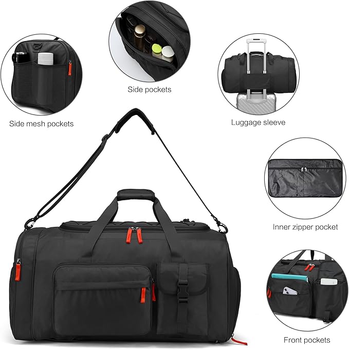 • 【Multifunctional Pockets & Design】Our duffle bag backpack has a total of 11 pockets. Includes 1 large internal mesh pocket and 2 internal zipper pockets; Outside: 2 front zip pockets, 1 flap pocket, 1 side zip pocket and 2 mesh water bottle pockets, 1 shoes compartment, 1 trolley luggage sleeve. The bottom zip pocket hides the backpack straps when not in use. And the elastic cord on top provides additional storage space for jackets or towels.