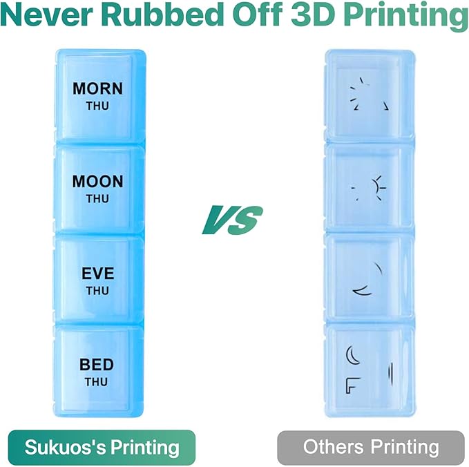 - No Need To Remember: 7-day pill organizer will track your pills 4 times a day (MORN NOON EVE BED), letter mark won't fade, and reminds you what to take by the day, you just need to fill our pill organizer once a week.