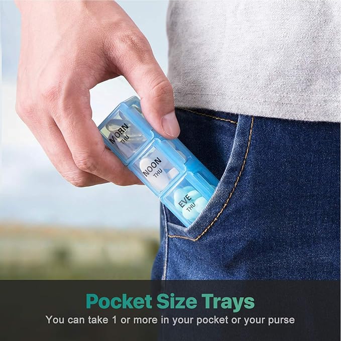 - Easy To Use: This pill box is designed with one-hand operation, easier for the elder and old to open, not to reduce every component dampproof performance. Pocket size trays allow you to take only 1 tray in your pocket and meet your daily medication needs.