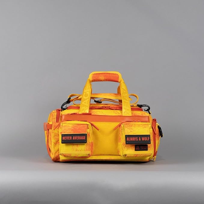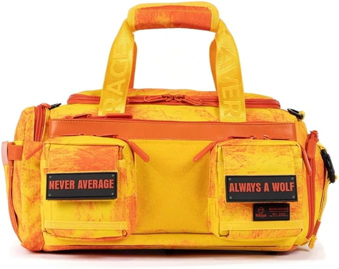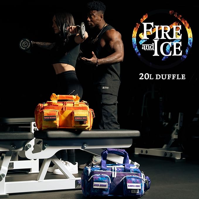 WOLFpak 20L Mini Duffle Bag for Gym & Travel | Waterproof Carry-On Weekender Bag with Shoe Compartment, Hard Bottom, and Tactical Molle System (Fire)