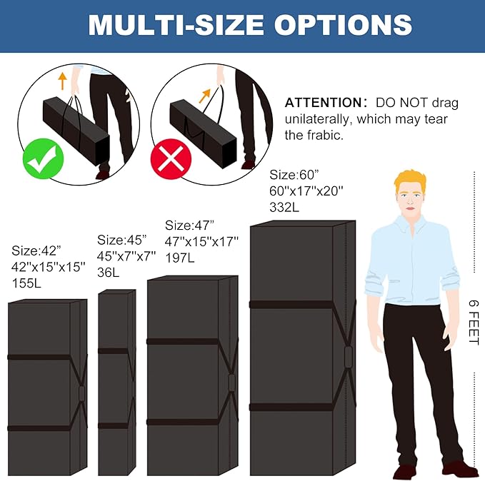 - Dimensions when full: 60" x 17" x 20" (L*W*H) with extra large capacity, travel bag with roomy interior for storing items. Ideal for camping, hunting and sport travel and even fits for umbrella style strollers