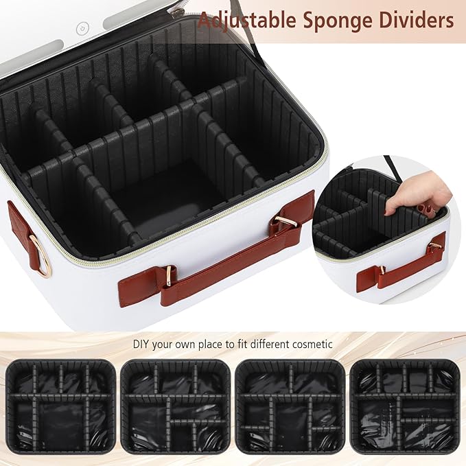 - 【Removable & Adjustable Dividers】The travel make up bag with led mirror comes with 6 removable EVA dividers and a brush storage board.which can accommodate multiple cosmetics and makeup brush specifications, and meet your needs for various combinations.With this travel makeup case with lighted mirror, you can keep all your cosmetics neatly organized and find what you need quickly and efficiently.