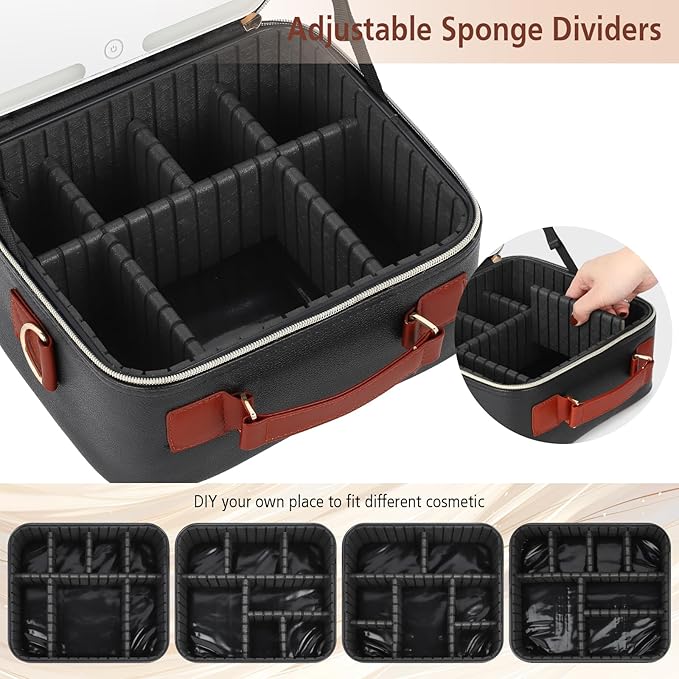 - 【Removable & Adjustable Dividers】The travel make up bag with led mirror comes with 6 removable EVA dividers and a brush storage board.which can accommodate multiple cosmetics and makeup brush specifications, and meet your needs for various combinations.With this travel makeup case with lighted mirror, you can keep all your cosmetics neatly organized and find what you need quickly and efficiently.