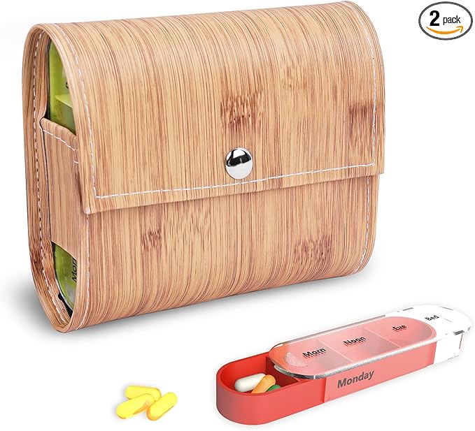 Pill Organizer,LIZIMANDU Weekly Travel Pill Case Box Medication Reminder Daily AM PM, Day Night 7 Compartments,for 4 Times A Day, 7 Days a Week-Includes Leather PU Carrying Case(1-Wood-Beige)