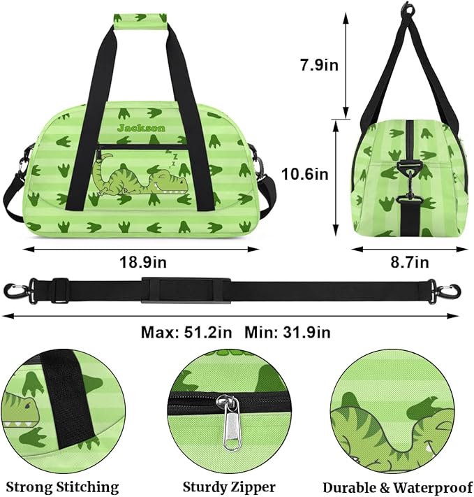 Personalized Duffel Bag for Kids Girls Boys, Cute Dinosaur Custom Name Gym Bag Overnight with Padded Handles Carry On Weekend Sports Travel Bag for School Practice Gymnastics Ballet