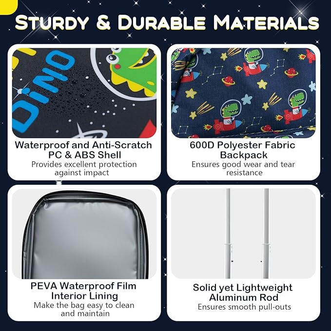 - [ Easy to Maneuver ]: Featuring a 3-level telescoping handle that can extend from 21" to 32", this kid's luggage creates a comfortable fit for children of different heights. And it is equipped with 4 flexible universal wheels for effortless movement, making it easy for your child to navigate through airports, train stations or school hallways with ease.