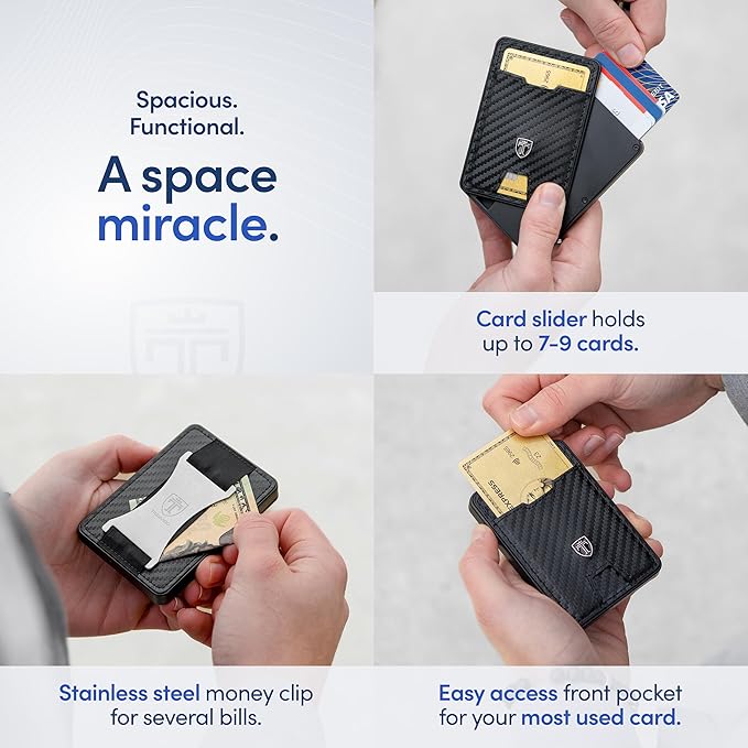 - 𝐐𝐔𝐈𝐂𝐊𝐄𝐒𝐓 𝐀𝐂𝐂𝐄𝐒𝐒 𝐓𝐎 𝐘𝐎𝐔𝐑 𝐂𝐀𝐑𝐃𝐒 - The patented SWYPE mechanism of this men's wallet pops out your cards with only one movement, enabling you to see all your cards at a glance and find your needed card instantly. The attached premium carbon leather front pocket of this wallet allows you to push out the most-used card quickly. No more fumbling around!