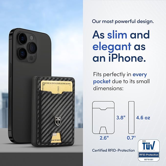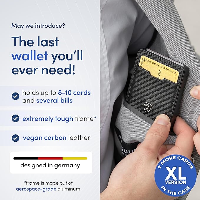 - 𝐑𝐅𝐈𝐃 𝐁𝐋𝐎𝐂𝐊𝐈𝐍𝐆 - The RFID blocking function of our front pocket wallet has been certified by the independent institute TÜV Germany for completely blocking the RFID frequency 13.56 MHz. This protects your cards in the aluminum frame and also the front pocket from being read