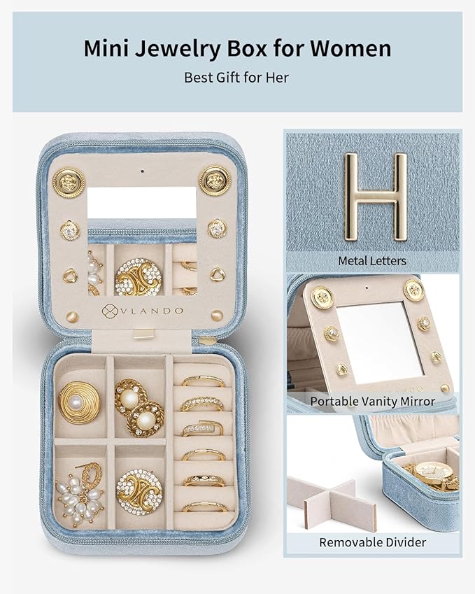 Vlando Jewelry Case for Girls Womens Fashion, Pink Jewelry Box Travel Must Haves, Jewelry Box for Girls, Small Travel Jewelry Case Birthday Gifts for Travel Gifts for Women - Letter H, Blue