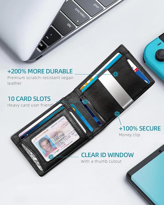 - Money Clip Design - Measuring 4" x 3.5", this slim men's wallet boasts a money clip structure that occupies less space than traditional bill compartments, effectively minimizing bulk. It includes 11 card slots: a quick-access slot on the front, 10 regular slots on the inner card sleeves, and an integrated dedicated AirTag pocket. (AirTag not included)