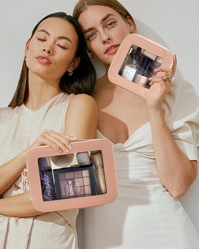 - Clear Design: Our 2 Pcs Travel Makeup Bag is elegant ,and stylish, designed in a minimalist boxy shape,is sleek and minimalistic look for your makeup accessories collection. And is designed with a transparent PVC window,all items are clear at a glance, and you can quickly choose the cosmetics you need.Portable and lightweight Slip it into your purse, backpack, everyday tote or travelling bag for easy access to your must-have items. Large Size:8.1'' x 6.1'' x 2.5'', Mini Size:5.1'' x 4.8''x 2''.