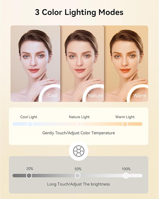 - 💡【SMART THREE-COLOR FILL LIGHT MIRROR】Smart fill light mirror with light intensity memory function, usable independently. Mirror stand adjusts 360° & 30°, 60°, 90°. Touch switch adjusts cool, natural, warm light, revealing true skin and facial details. Confidently face any makeup scenario. Long press for brightness control, unaffected by environment. 2000mAh battery removes battery worries.